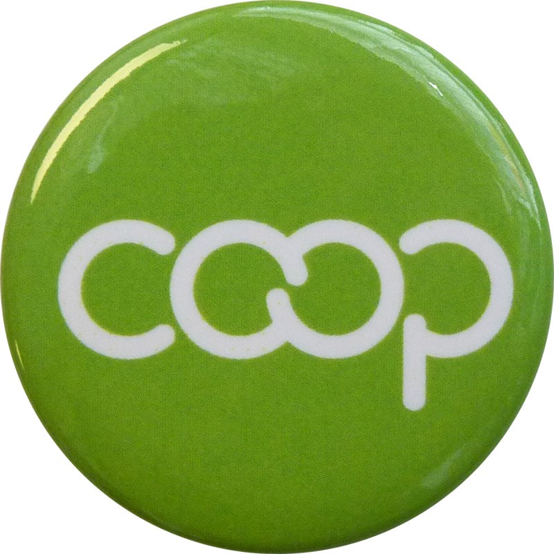 1.5″ digitally printed round Co-op buttons, laminated with safety pin backing.