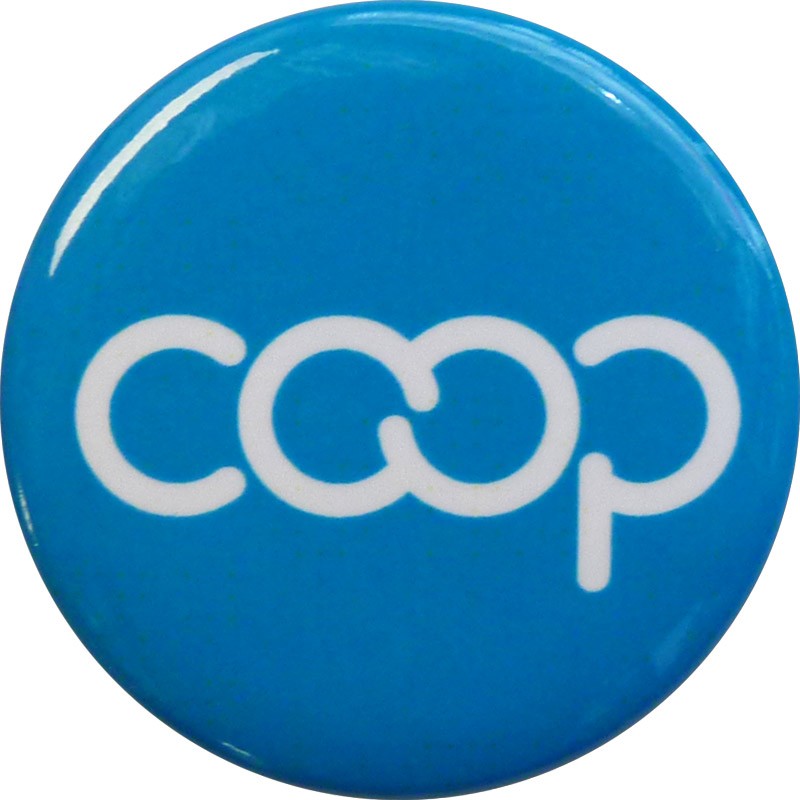 1.5″ digitally printed round Co-op buttons, laminated with safety pin backing.