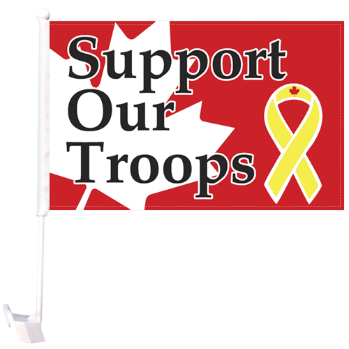 Our Support Our Troops car flags are printed on knitted polyester, the ideal fabric for moving vehicles. The white window pole and clip are made of plastic, strong enough to be used on the highway. These car flags clip nicely onto most car windows.
